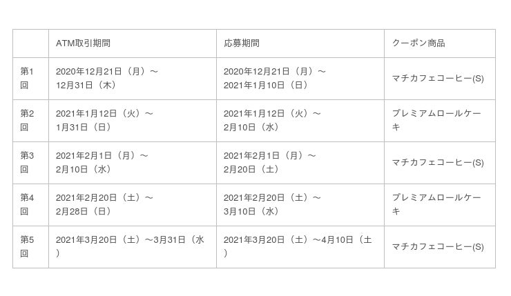 無料クーポン第1回(ATM取引期間:2020年12月21日(月)~2020年12月31日(木)、応募期間:2020年12月21日(月)~2021年1月10日(日))は、「マチカフェコーヒー(S)」です。