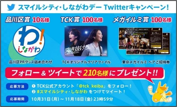 11月18日(金)スマイルシティ・しながわデーの実施を記念し、Twitterキャンペーンを実施します。TCK公式Twitterアカウント(@tck_keiba)フォロー&「#スマイルシティ・しながわ」をつけてツイートするだけで応募は完了。抽選で品川区PRグッズ詰め合わせやTCKオリジナルクリアファイル、東京メガイルミ ペアご招待券をプレゼントします。