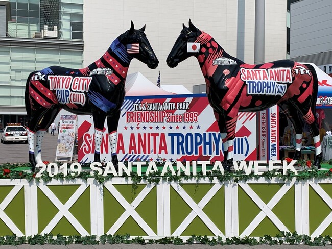 10月31日(月)から11月4日(金)までを「サンタアニタウィーク」と題し、日米友好交流のあゆみなどを紹介する特設サイト公開やアメリカ競馬グッズなどが当たるTwitterキャンペーンを実施します。また、場内には、赤青白を基調とした米国風の装飾やサンタアニタ競馬場を紹介するブースを設置。11月2日(水)「サンタアニタトロフィー(SIII)」当日には、サンタアニタ競馬場のキャラクター「ラッキー」&「ウィニー」が3年振りに来場し、TCKキャラクター「うまたせ!」&「ウマタセーヌ」とともに場内を盛り上げます。