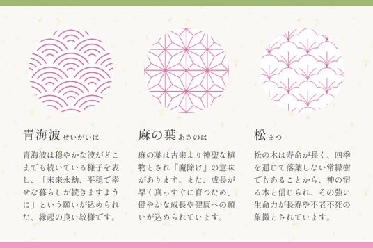「青海波(せいがいは)」「麻の葉」「松」など、古来より日本に伝わる縁起のよい和柄文様を、デザインの随所に取り入れています。