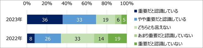 今年(2023年)調査では「重要だと認識している」が最多で36%、次いで「やや重要だと認識している」が33%となり、これらを合わせて「重視派」(以降、同じ)は69%とほぼ7割に上っている。一方、昨年(2022年)調査では「重視派」の割合は34%で、「重要だと認識している」については僅か8%にとどまっていた。この1年間で「重視派」の割合は35ポイントも増加しており、急速に人的資本経営に対する企業の意識が高まっていることが分かる。