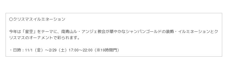 南青山ル・アンジェ教会は、期間中街全体が美しく輝きを放ちイルミネーション一色に染まる冬の表参道・原宿エリアにおいて、エリア内で一番早い(※2) 11月1日(金)にイルミネーションの点灯を開始いたします。