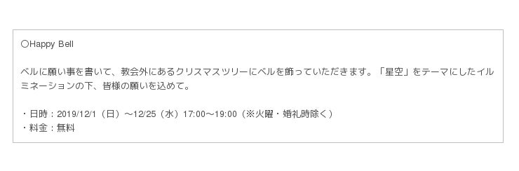 イルミネーションの他、クリスマスイベントでは、今年はベルに願い事を書いて教会外にあるクリスマスツリーに飾る“Happy Bell”が復活。また、歌声が美しく響き渡る礼拝堂の中でクリスマスソングをお楽しみいただけるシンフォニックゴスペルコンサート(チケットぴあにて事前要予約)、無数のキャンドルが大理石のバージンロードに煌めくキャンドルナイト(※3) をはじめとする各種イベントを開催いたします。