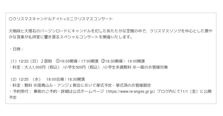 各種イベントの事前ご予約・詳細は、公式ホームページ(https://www.le-anges.gr.jp)ブログ内にて11月1日(金)に公開予定。詳細・お問い合わせは、南青山ル・アンジェ教会コンシェルジュ(tel. 03-5411-2722 / 受付時間10:00~19:00)までお願いいたします。