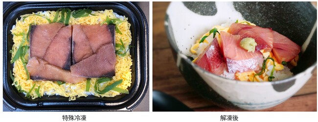 解凍するとブリの刺身は生で酢飯はあたたかい、新感覚のブリ丼。錦糸卵や大葉で彩豊かに仕上げました。
