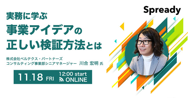 新規事業開発に携わる皆様向けのお役立ち情報を共有するSpready株式会社(東京都港区、代表取締役:佐古雅亮)主催セミナーに、同社の株主及び資本業務提携関係にある株式会社ベルテクス・パートナーズ(東京都港区、代表取締役:山口正智)より、 コンサルティング事業部 シニアマネージャーの川合宏明が登壇します。