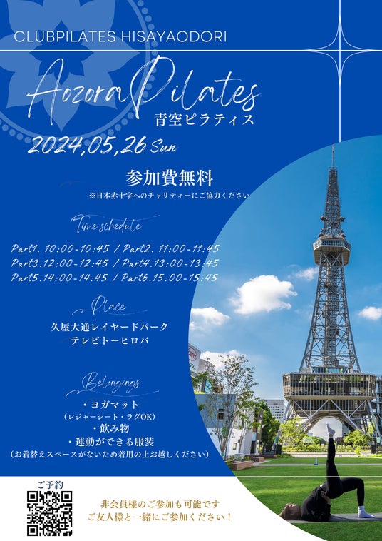 CLUB PILATES HISAYAODORIスタジオ主催チャリティーイベント「青空ピラティス@久屋大通レイヤードパーク」の開催も2024年5月26日(日)に決定いたしました。スタジオから飛び出して、青空の下”マットピラティス”を体験してみませんか?国際資格を持ったインストラクターが45分間しっかりと行っていきます!