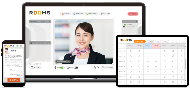 ◆ROOMSサービスサイト: https://rooms-online.jp/「ROOMS」は、国産のオンライン接客専用システムです。ZoomやTeamsといった海外産Web会議ツールとは異なり、日本の接客シーンに特化した機能・おもてなし要素を豊富に搭載しております。アプリのダウンロードは双方不要。URLを共有する、もしくは接続に必要なルームナンバーを電話で相手に伝えるだけで接続がスタートでき、いつでも、どこでも、様々なデバイス(パソコン・スマートフォン・タブレット)にて、ワンクリックで商談を開始することが可能です。スタッフの空き状況をカレンダーに公開し、お客様側から予約ができる機能も標準装備。日程調整のやり取りが省けるだけでなく、接続URLの自動送信や担当スタッフの自動アサイン機能もついています。ご導入企業のサービス名やロゴを入れたオリジナルデザインルームを作ることもできるため、展開ブランドの世界観を崩すことなく接客できることも、大きな特長です。