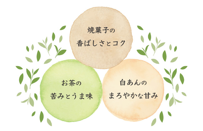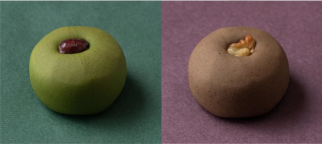 使用するのは、茶師厳選の「お抹茶」と「ほうじ茶」。それぞれを練り込んだ生地でまろやかな白あんを包み、ころんと可愛く焼き上げました。抹茶には小倉を、ほうじ茶にはクルミを乗せて、食感と風味のアクセントに。白あんはお茶の味を引き立て、全体が調和するよう、あっさりとなめらかな舌ざわりと甘みに炊き上げました。