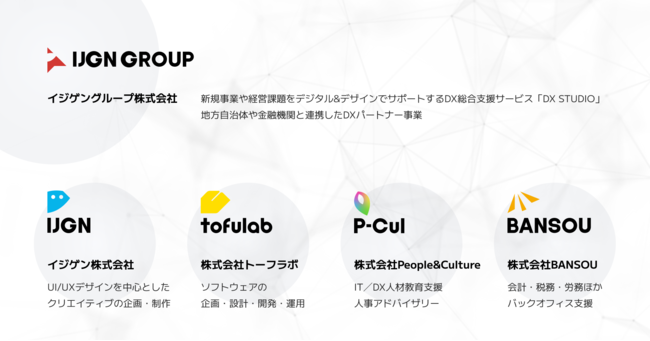 グループ会社:イジゲン株式会社、株式会社People&Culture、株式会社BANSOU、株式会社トーフラボ