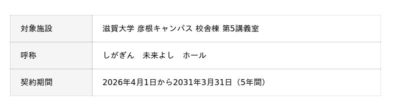 これにより、2026年4月1日から5年間、「滋賀大学 彦根キャンパス 校舎棟 第5講義室」の呼称は