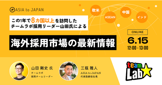 そこで今回は、海外からの採用活動を積極的展開し、コロナ禍が明ける前から既に8ヶ国へ足を運んでいるチームラボの採用リーダーである山田氏に登壇いただきセミナーを実施いたします。