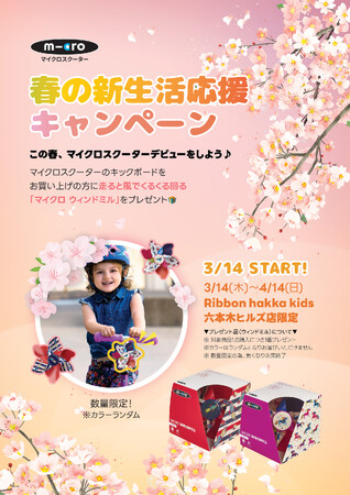世界80カ国の子供たちに愛されるプレミアムキックボードブランドのマイクロスクータージャパン(東京都港区)が春のシーズンを迎え、Ribbon Hakka Kids六本木ヒルズ店で3月14日から1ヶ月間、春の新生活応援キャンペーンを行うと発表しました。 お出かけが増えるシーズンを迎え、春の雰囲気をまとったウィンドウディスプレイでお客様をお出迎え。春の象徴である桜のカラーとよくマッチするマイクロスクーターならではの鮮やかなカラーが綺麗にディスプレイされ、来店される皆様の視線を集めています。