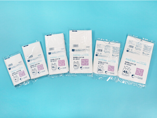 50枚入の5L(厚さ0.015mm)、10L(厚さ0.017mm)、15L(厚さ0.018mm)の3種類と20枚入の20L(厚さ0.025mm)、30L(厚さ0.022mm)、45L(厚さ0.022mm)の3種類で合計6種類です。