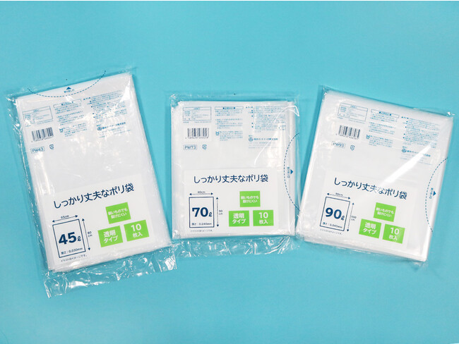 10枚入の45L(厚さ0.030mm)、70L(厚さ0.040mm)、90L(厚さ0.045mm)の合計3種類です。