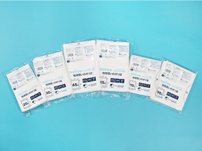 50枚入の20L(厚さ0.013mm)、30L(厚さ0.013mm)、45L(厚さ0.015mm)の3種類と、10枚入の45L(厚さ0.015mm)、70L(厚さ0.020mm)、90L(厚さ0.020mm)の3種類で、合計6種類です。