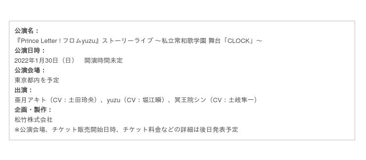 10月24日(日)より配信がスタートする新作ボイスドラマ『Prince Letter(s)! フロムyuzu』のクライマックスと連動した公演「ストーリーライブ」を、2022年1月30日(日)に実施することが決定しました。『Prince Letter(s)! フロムアイドル』では初となる有観客のイベントになります。公演では最終話となる第7話の直前の第6.5話を朗読劇形式で披露する他、歌唱パフォーマンスやアフタートークも予定しております。最新情報は公式Twitter等でご確認ください。