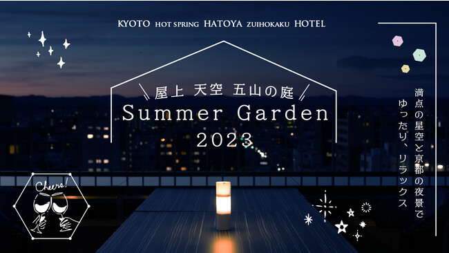 株式会社ハトヤ瑞鳳閣(所在地:京都市下京区)が運営する「屋上 天空 五山 の庭」におきまして、2023年6月26日(月)より『Summer Garden 2023-屋上 天空 五山の庭』の営業を開始することとなりました。ハイボール、瓶ビール、ノンアルビール、焼酎などのお飲み物や、総料理長自慢の和食料理をお楽しみいただけます。アクセスは京都駅より徒歩5分の好立地、京都の北側の景色が一望できます。この夏は満点の星空と京都の夜景でゆったり、リラックスしてみませんか?