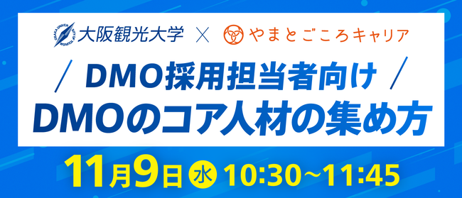 大阪観光大学(所在地:大阪府熊取町、学長:山田良治)と株式会社やまとごころキャリア(本社:東京都江東区、代表取締役:磯部武秀)は、2022年11月9日にDMO採用担当者向けセミナー「DMOのコア人材の集め方」を開催いたします。