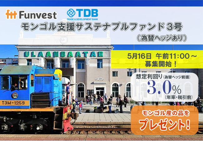 「未来をわかちあう投資」を提供する「Funvest(ファンベスト)」(以下、Funvest)は、「モンゴル支援サステナブルファンド3号(為替ヘッジあり)」(以下、本ファンド)の募集を5/16より開始しますので、お知らせいたします。