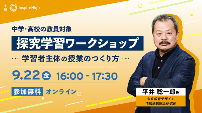 「世界とつながる探究的な学びを手軽に教室で」をコンセプトとしたEdTech教材を提供する株式会社Inspire High(本社:東京都千代田区、代表:杉浦太一)は、平井聡一郎氏をお招きし、9月22日(金)に探究学習のワークショップをオンラインにて開催します。