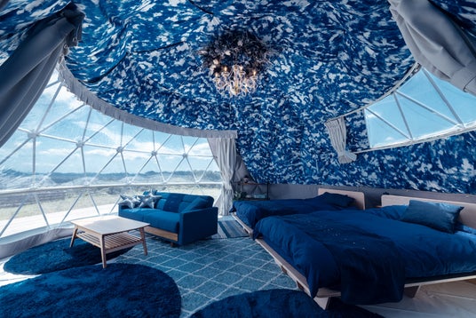 岡山のグランピング施設に「岡山らしさ」を藍色の空に喩え表現された大空間、