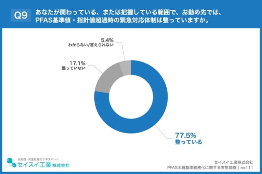 「Q9. あなたが関わっている、または把握している範囲で、お勤め先では、PFAS基準値・指針値超過時の緊急対応体制(仮設処理や操業調整等)は整っていますか。」(n=111)と質問したところ、「整っている」が77.5%、「整っていない」が17.1%という回答となりました。