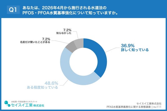 「Q1. あなたは、2026年4月から施行される水道法のPFOS・PFOA水質基準強化(水道水50ng/L以下の義務化)について知っていますか。」(n=111)と質問したところ、「詳しく知っている」が36.9%、「ある程度知っている」が48.6%という回答となりました。