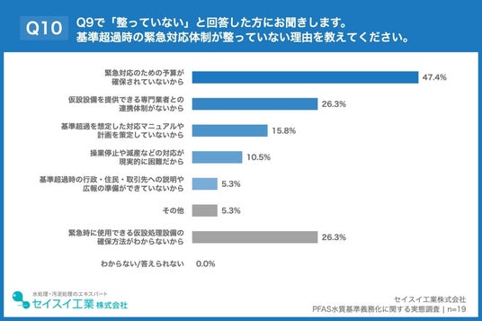 「Q10. Q9で「整っていない」と回答した方にお聞きします。基準超過時の緊急対応体制が整っていない理由を教えてください。(複数回答)」(n=19)と質問したところ、「緊急対応のための予算が確保されていないから」が47.4%、「仮設設備を提供できる専門業者との連携体制がないから」、「緊急時に使用できる仮設処理設備の確保方法がわからないから」が26.3%という回答となりました。