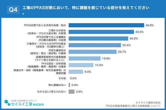 「Q4. 工場のPFAS対策において、特に課題を感じている部分を教えてください。(複数回答)」(n=111)と質問したところ、「PFAS対策で生じる汚泥の処理・処分」が46.8%、「工場からの排水(洗浄水・プロセス排水等)の管理」が40.5%、「PFAS対策で生じる濃縮水(RO膜の廃液等)の処理」が36.9%という回答となりました。