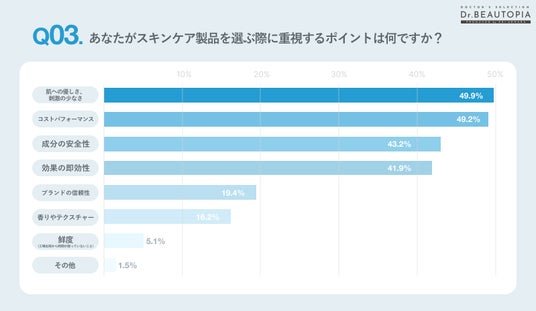 「スキンケア製品を選ぶ際に重視するポイント」は、約半数が「肌への優しさ、刺激の少なさ」(49.9%)、「コストパフォーマンス」(49.2%)と回答。