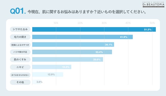 「現在の肌悩み」については、半数の人が「シワやたるみ」(51.5%)を挙げ、次いで「毛穴の開き」(41.9%)、「乾燥によるカサつき」(34.1%)が主要な悩みとして挙げられました。