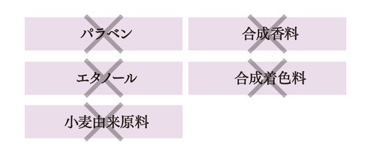 毎日安心してお使いいただける化粧品を目指して、肌にとって不要なものは極力排除しました。パラベン、エタノール、合成香料、合成着色料、小麦由来原料不使用。また、パッチテスト*4、ノンコメドジェニックテスト済み*5です。
