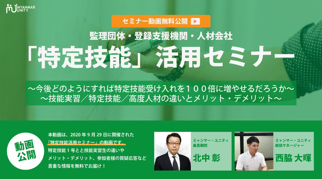2020年10月2日(金)、ミャンマー最大の政府認定送り出し機関ミャンマー・ユニティ(日本駐在営業部:東京都千代田区岩本町)は、同年9月29日(火)に開催した「「特定技能」活用セミナー ~激変した外国人雇用。今後どのようにすれば特定技能受け入れを100倍に増やせるだろうか~ 」のセミナー動画の無料公開を開始いたしました。以下のページからお申込受付中。