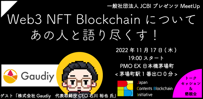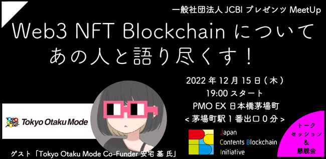 コンテンツ関連企業50社が加入する一般社団法人ジャパン・コンテンツ・ブロックチェーン・イニシアティブ(略称、一般社団法人JCBI)は、「Web3 NFT Blockchain」をテーマとした第3回のミートアップイベントを、ゲストスピーカーとして株式会社Tokyo Otaku Mode Co-Funderの安宅 基 氏をお招きして、以下のとおり2022年12月15日(木)に開催します。