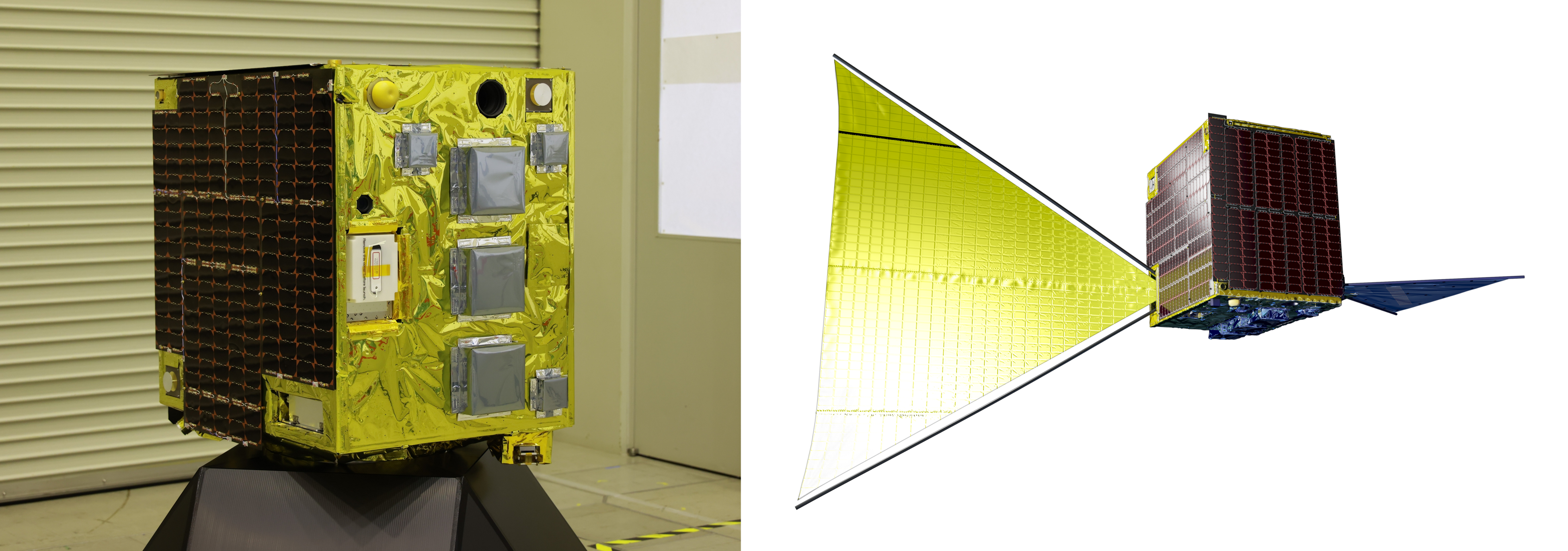 (左)小型実証衛星4号機(RAISE-4)のフライトモデル、画像左側面の下部にD-SAILが収まる(右)小型実証衛星4号機(RAISE-4)展開形態イメージ図 (C)JAXA