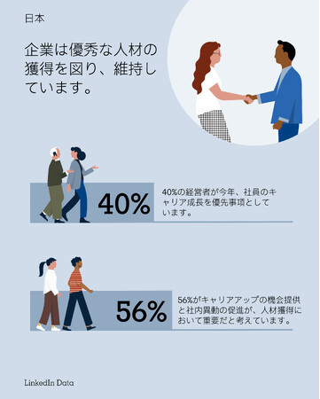 ビジネスに特化した世界最大のプロフェッショナルネットワークであるLinkedIn(リンクトイン、日本法人所在地:東京都千代田区、日本代表:田中 若菜)は、労働市場における人材育成に関する調査を実施しました。調査の結果、企業の77%が今年従業員のスキルアップと能力の向上を高める計画を立てていることが分かりました。また、採用担当者の56%がキャリアアップの機会提供と社内異動の促進が、人材獲得と維持において重要だと考えていることが明らかになりました。