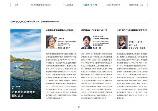 こうしたこれまでの動きを国際機関や政府、企業、金融機関、NGO、アカデミアなど様々な専門家やステークホルダーの声と共にご紹介する「東京サステナブルシーフード・サミット 第10回記念レポートームーブメントの軌跡、未来への展望ー」(仕様:A4、PDF、全25ページ)を発行しました。