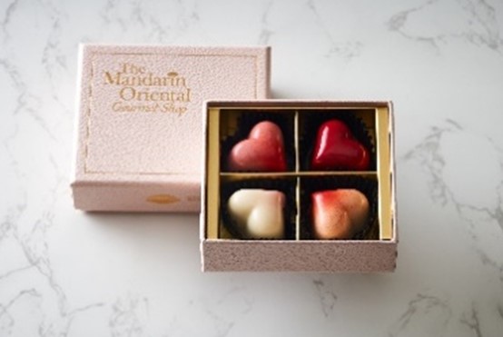 甘酸っぱくてロマンティックな気持ちを代弁するようなハート型のチョコレート、「ライチ&赤スグリ」、「いちご」、「ラズベリー」、「いちご&ローズ」をロゴ入りのギフトボックスに詰めました。