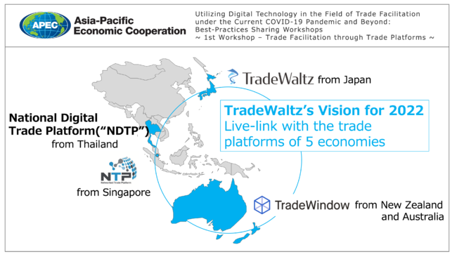 本事業は、その結果を基に、インド太平洋地域でのサプライチェーンを更に強靭化すべく、2021 年 5 月 11 日にニュージーランド開催された国際会議 APEC2021 ワークショップにて、トレードワルツより提案したものです。TradeWaltz(日本)-NTP(シンガポール)-NDTP(タイ)-TradeWindow(オーストラリア、ニュージーランド)という 5 カ国の貿易 PF 間をシステム連携し、通関の元情報となる実ビジネスの商流電子データを連携していくことで、通関業務をより効率化できることを実証します。本事業は、2022 年 APEC 議長国のタイがナショナルプロジェクトとして進めるプロジェクトとなっており、成果は APEC2022 首脳会議(2022年11月14日)で発表を計画しています(※1)。