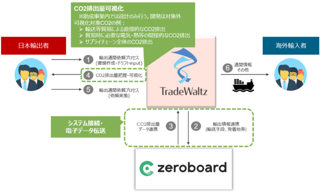 また、各貿易事業者における脱炭素経営方針に沿った事業運営を可能とするべく、事業・サプライチェーンで排出されるCO2 を計測するソリューション zeroboard と TradeWaltz を連携し、各貿易における CO2 排出量を捕捉できるよう試みます。(※東証プライム上場企業は特にサプライチェーン上の排出量/GHGプロトコル Scope3の計測が促されています。 https://newswitch.jp/p/31215)