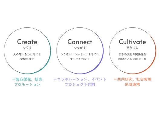 プロダクト、空間、活動を通して生まれた価値を、企業や地域、個人などさまざまな人と共有しながら、次のアクションへとつなげていきたいという願いを込めました。