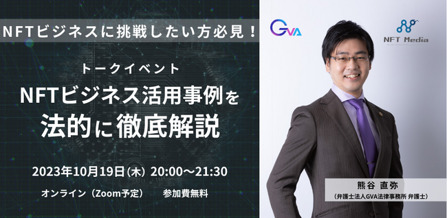 株式会社トレジャーコンテンツ(本社:東京都文京区、代表取締役:小林 憲人)が運営するNFT専門メディア「NFT Media」は、弁護士法人GVA法律事務所(以下、GVA法律事務所)の熊谷直弥弁護士をお招きし、NFTビジネスに挑戦したい方へ向けた 「NFTビジネス活用事例を法的に徹底解説」トークイベントを開催いたします。