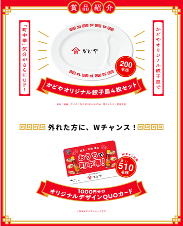 かどやオリジナルの餃子皿4枚セットが200名様に当たる!さらに510名様に1,000円分のQUOカードが当たるWチャンスも!