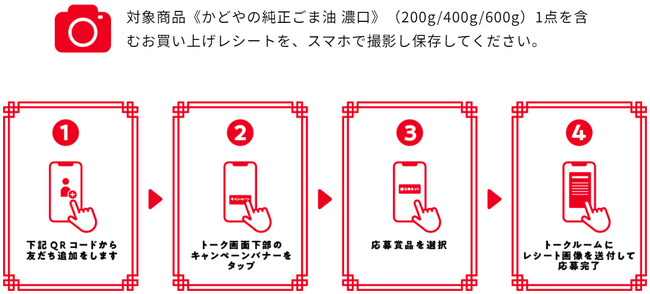 3.応募条件を満たしたレシートを撮影し、かどや製油公式LINEアカウントに画像を送付。