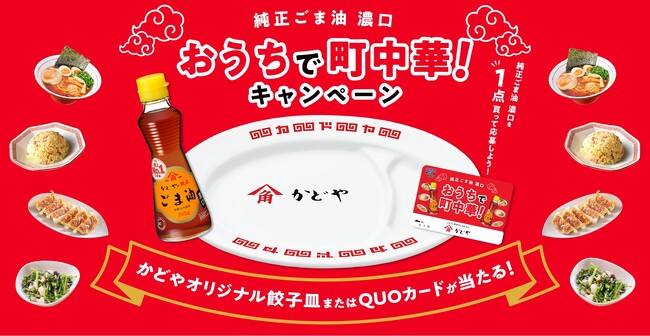 1858年に小豆島で創業し、165年にわたって“ごま”を通じてお客様に健康と笑顔をお届けするかどや製油株式会社(所在地:東京都品川区、代表取締役社長:久米敦司)は、10月1日(日)より、「<純正ごま油 濃口>おうちで町中華!キャンペーン」を実施します。(https://www.kadoya.com/campaign-koikuchi2023/)