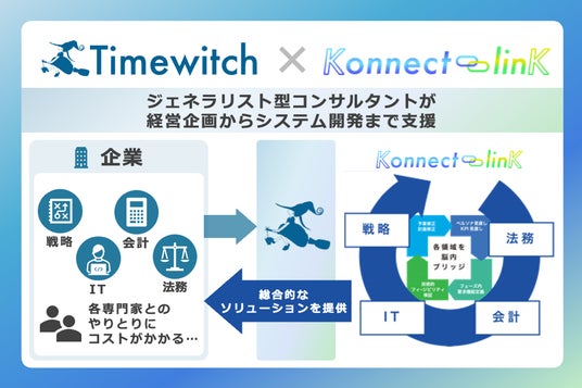 時差を活用して寝ている間に仕事を動かす「時差サービス」を提供する株式会社Timewitch(以下「Timewitch」)は、ジェネラリスト型コンサルタントを通じて経営支援を行う株式会社Konnect-linK(以下「Konnect-linK」)との業務提携を発表しました。この提携により、両社の強みを活かした総合的な経営支援サービスの提供を開始します。