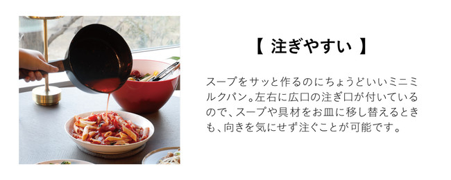 「広い注ぎ口形状」なので、「作った料理をお皿に移し替える時」や「スープやタレをそのままかけたい時」も