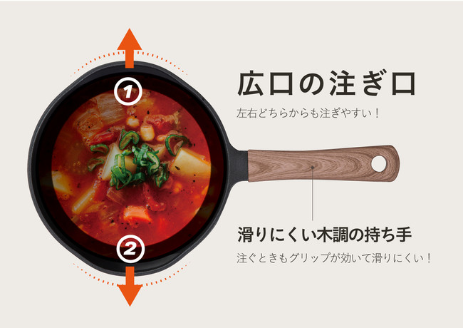 注ぎ口の向きやフライパンの持ち方を気にすることなく、“左右どちらからでも注ぎやすい”。