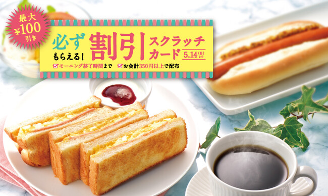 次回ご購入時にスクラッチカードをご提示いただくと、モーニングセット(単品も対象)が最大100円引きとなります。新生活がスタートするこの時期に、みなさまの“朝”を応援します。ぜひお好きなモーニングをお得にお試しください。